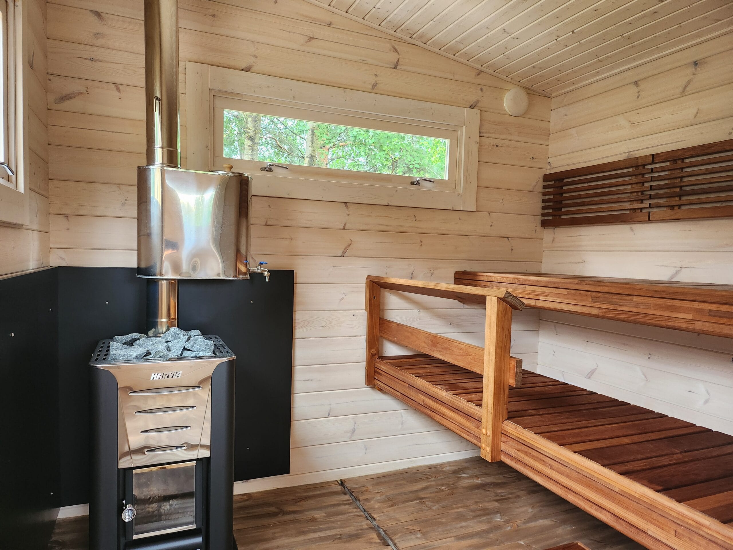 Saunan sydän on 5,3 m² löylyhuone, jossa tilaa riittää useammalle saunojalle kerrallaan. Tilava 6,6 m² pukuhuone tekee saunomisesta erityisen mukavaa – siellä on reilusti tilaa vaatteille, penkeille ja vilvoitteluun ennen ja jälkeen löylyjen. Saunaan kuljetaan pukuhuoneen kautta, mikä lisää käyttömukavuutta ja pitää löylytilan vedottomana ja lämpimänä.
