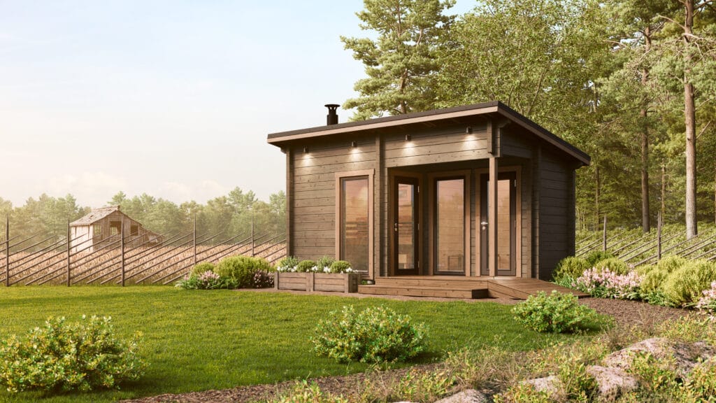 Rakennusala on 13 m², josta 6,1 m² on sauna. Saunassa on näyttävä korkea maisemaikkuna, joka tuo luonnon osaksi saunakokemusta ja lisää tilantuntua. 3 m² pukuhuone tarjoaa toimivan tilan vaatteiden vaihtoon ja vilvoitteluun.