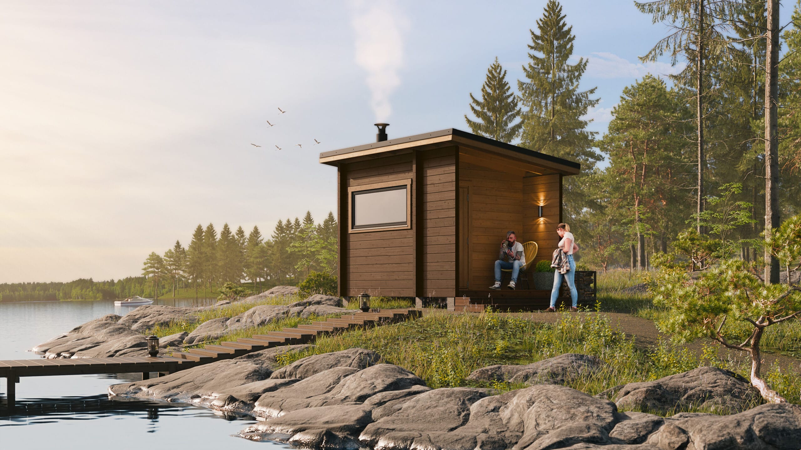 Saunassa on toimiva ja viihtyisä löylytila, jossa suuret ikkunapinnat tuovat luonnon ja maiseman osaksi saunaelämystä. Lauteet ja kiuas ovat valmiiksi asennettuina, joten sauna on käyttövalmis heti toimituksen jälkeen. Kompakti koko tekee Suvanto-Sauna 10:stä erinomaisen valinnan niin rantatontille, mökille kuin pihapiiriinkin.
