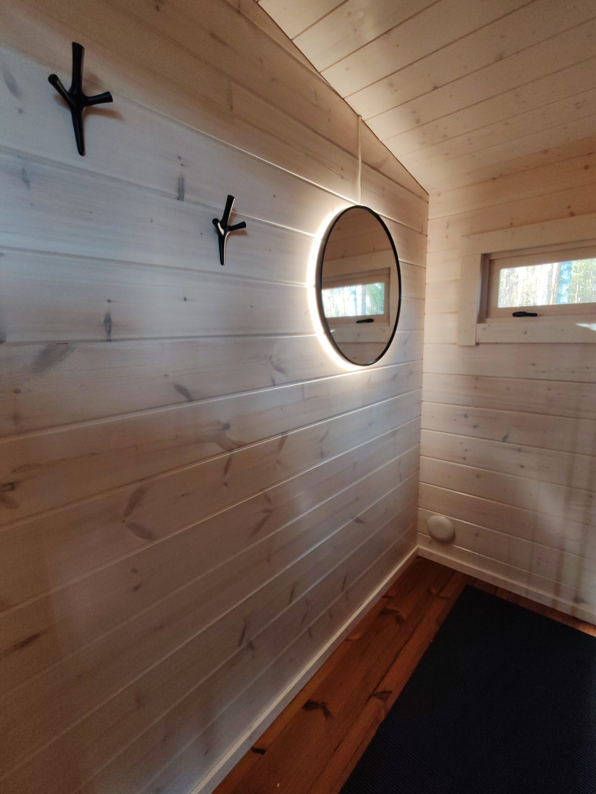 Teuva 32/2 on suunniteltu arjen sujuvuuteen. Sisäänkäynti kulkee katetun verannan kautta, josta siirryt vaivattomasti käytännölliseen pukuhuoneeseen ja edelleen löylyihin tai halutessasi suoraan valoisaan tupaan. Kulkureitti on looginen, eikä lämpö karkaa vääriin tiloihin. Pukuhuone tuo yksityisyyttä ja toimii samalla kuivatus- ja säilytystilana. Tupa on oikea monitoimialue: iltapalan kattaukseen, vierasmajoitukseen, etätyöpäivän rauhalliseen hetkeen tai lasten leikkipaikaksi sateen sattuessa. Katettu veranta puolestaan pidentää kautta – se houkuttelee ulos silloinkin, kun aurinko ei paista pilvettömältä taivaalta.